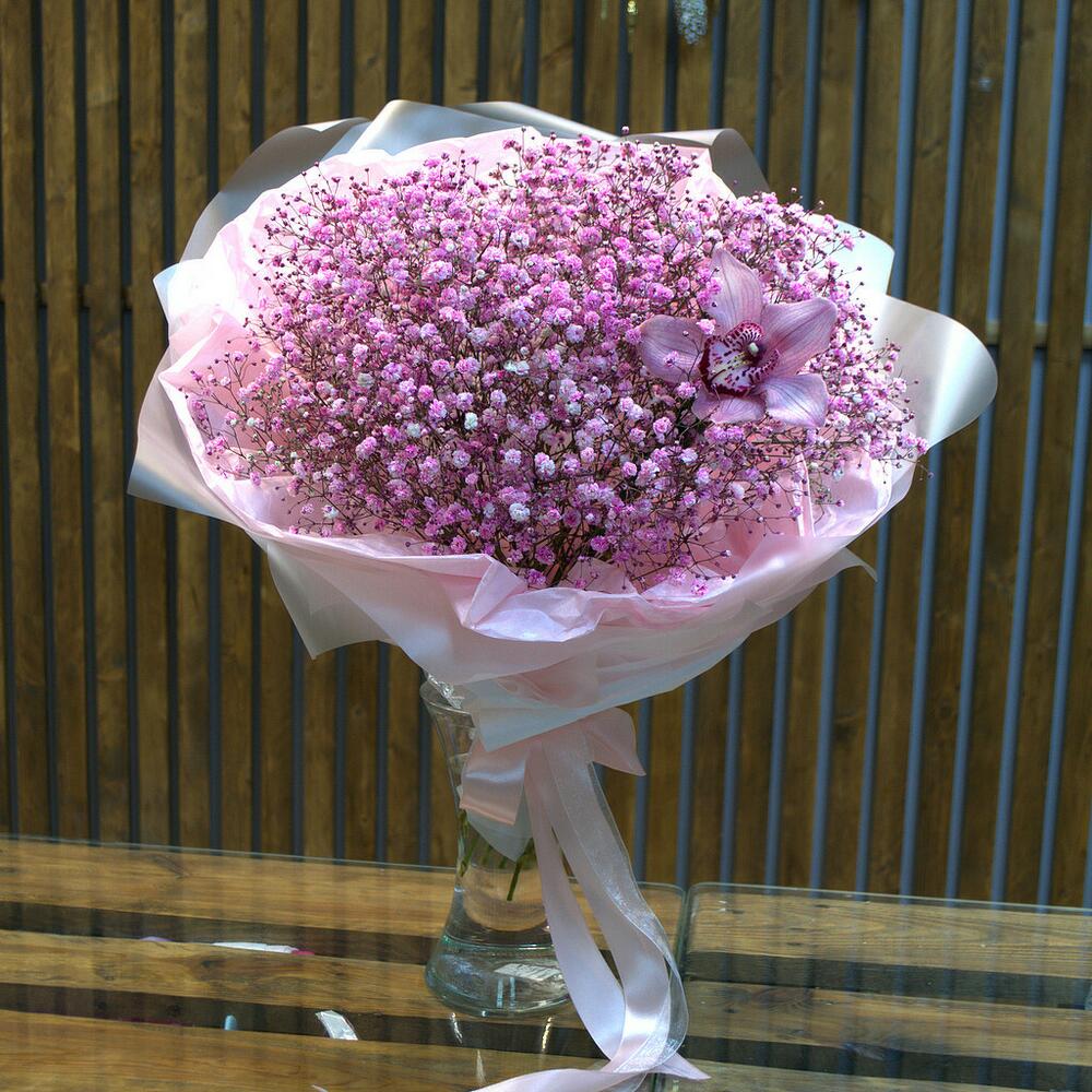 Авторский букет из 11 веточек гипсофилы с орхидеей