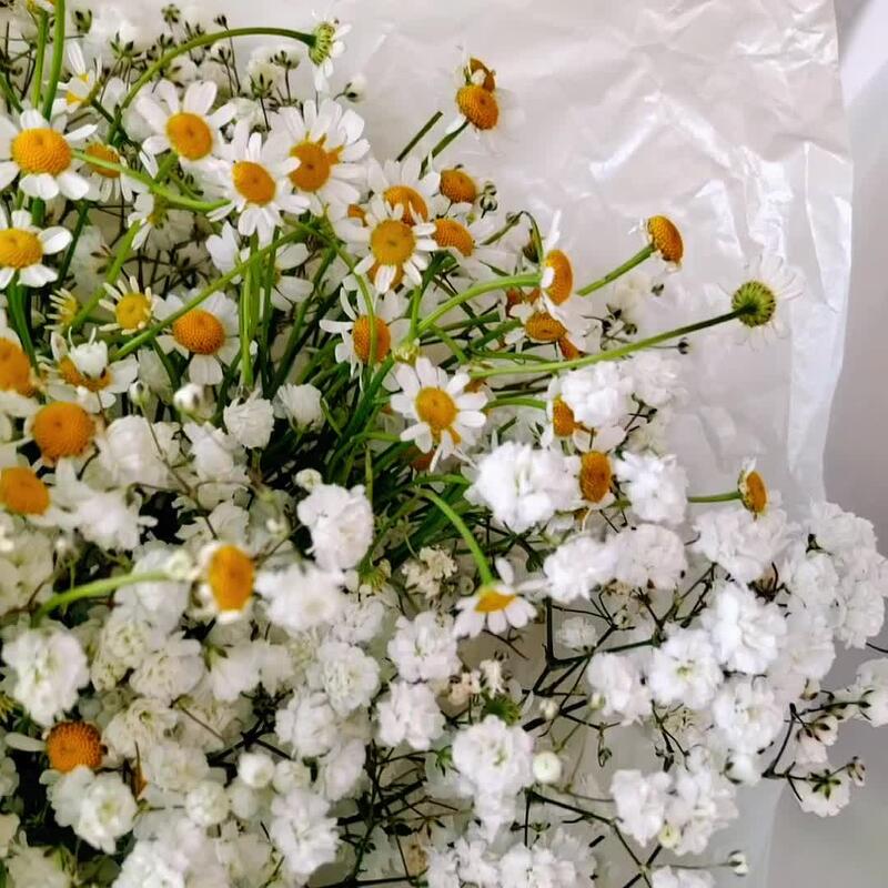 Лента атласная – 3 шт.Ромашка кустовая – 7 шт.Упаковка дизайнерская – 3 шт.гипсофила белая – 5 шт.