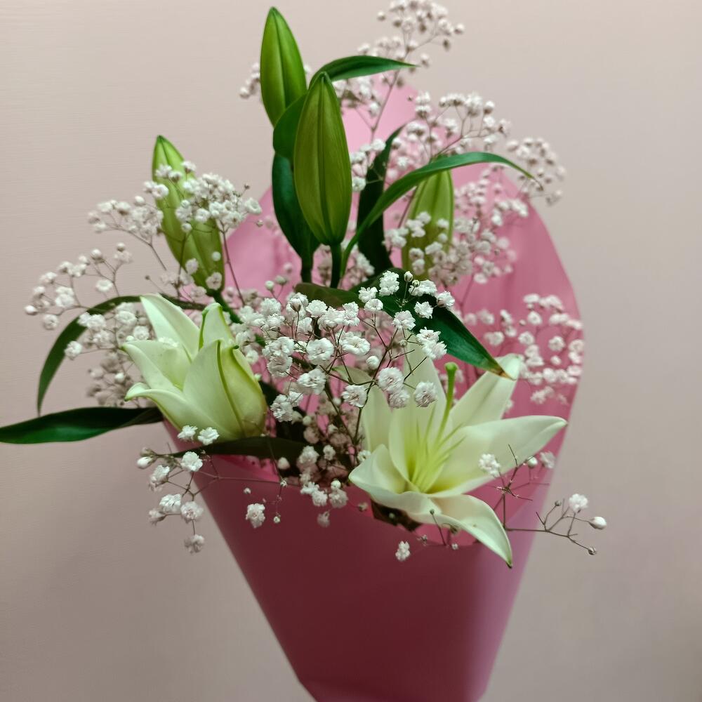 Упаковка – 1 шт.Лилия белая – 1 шт.Гипсофила розовая – 1 шт.