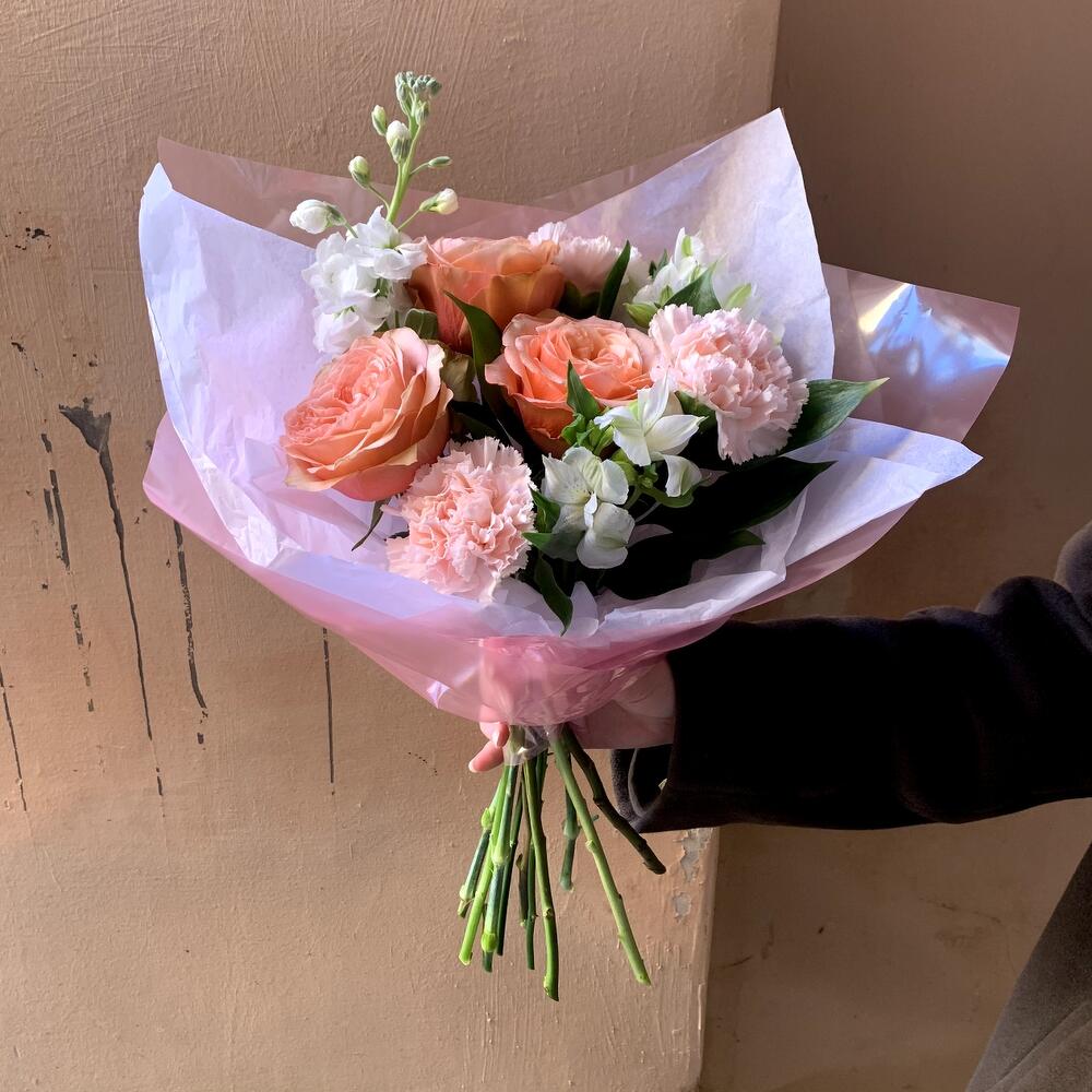 Авторский букет “Маленькая нежность”: пионовидная роза, нежная гвоздика и ароматная маттиола