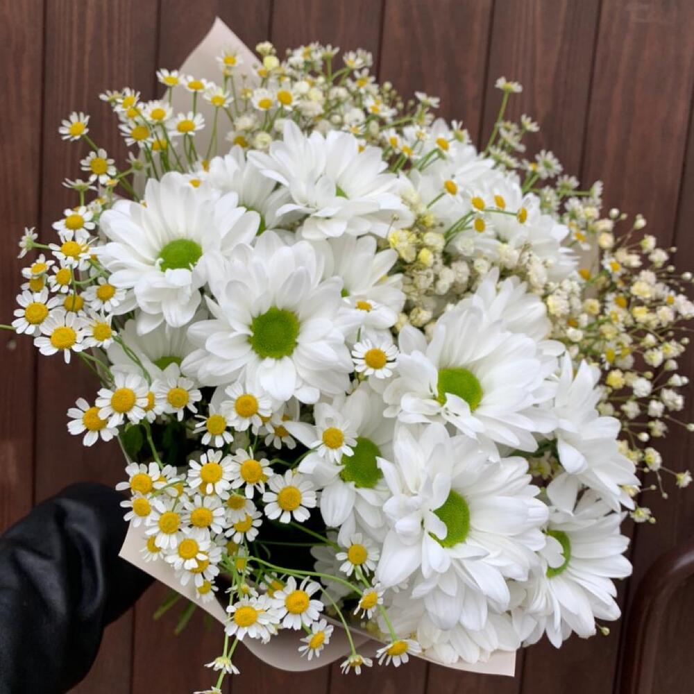 Хризантема кустовая – 5 шт.Матрикария (Ромашка Камила) – 5 шт.Гипсофила – 3 шт.Упаковка дизайнерская – 2 шт.Лента атласная – 2 шт.