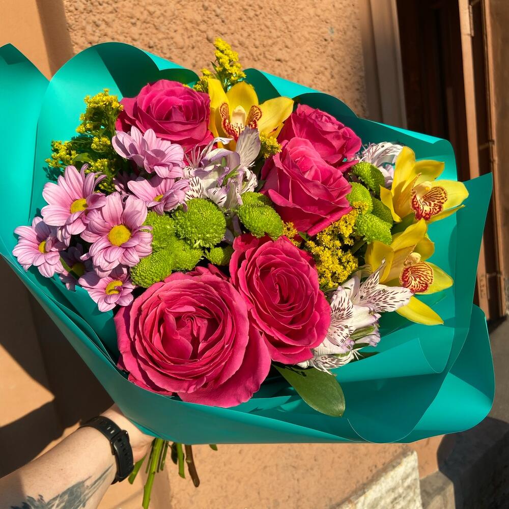 Pink floyd – 5 шт.Орхидея Цимбидиум – 3 шт.Альстромерия – 3 шт.Хризантема кустовая – 4 шт.Солидаго – 3 шт.Рускус – 5 шт.Упаковка дизайнерская – 3 шт.Лента атласная – 2 шт.