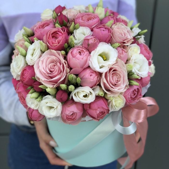 Сильвия – 12 шт. эустома белая – 5 шт. пинк мондиаль – 8 шт. Коробка шляпная – 1 шт. Оазис – 1 шт. Оформление лента – 1 шт.