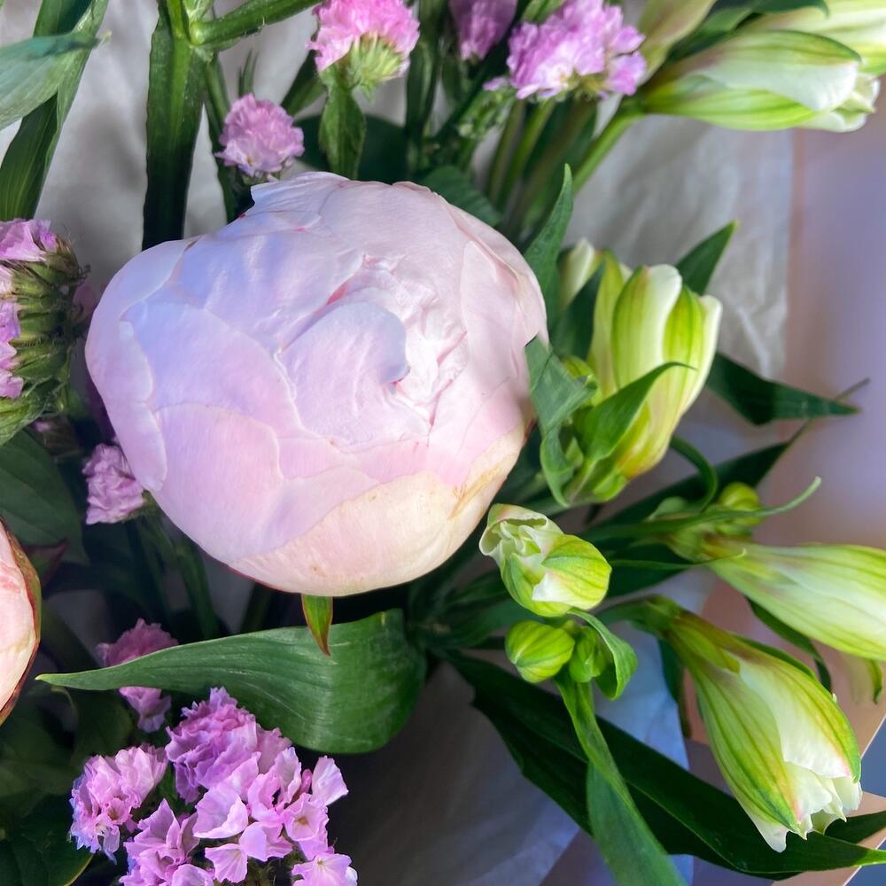 Упаковка – 1 шт.Альстромерия белая – 3 шт.Пион розовый – 3 шт.Статица розовая – 1 шт.