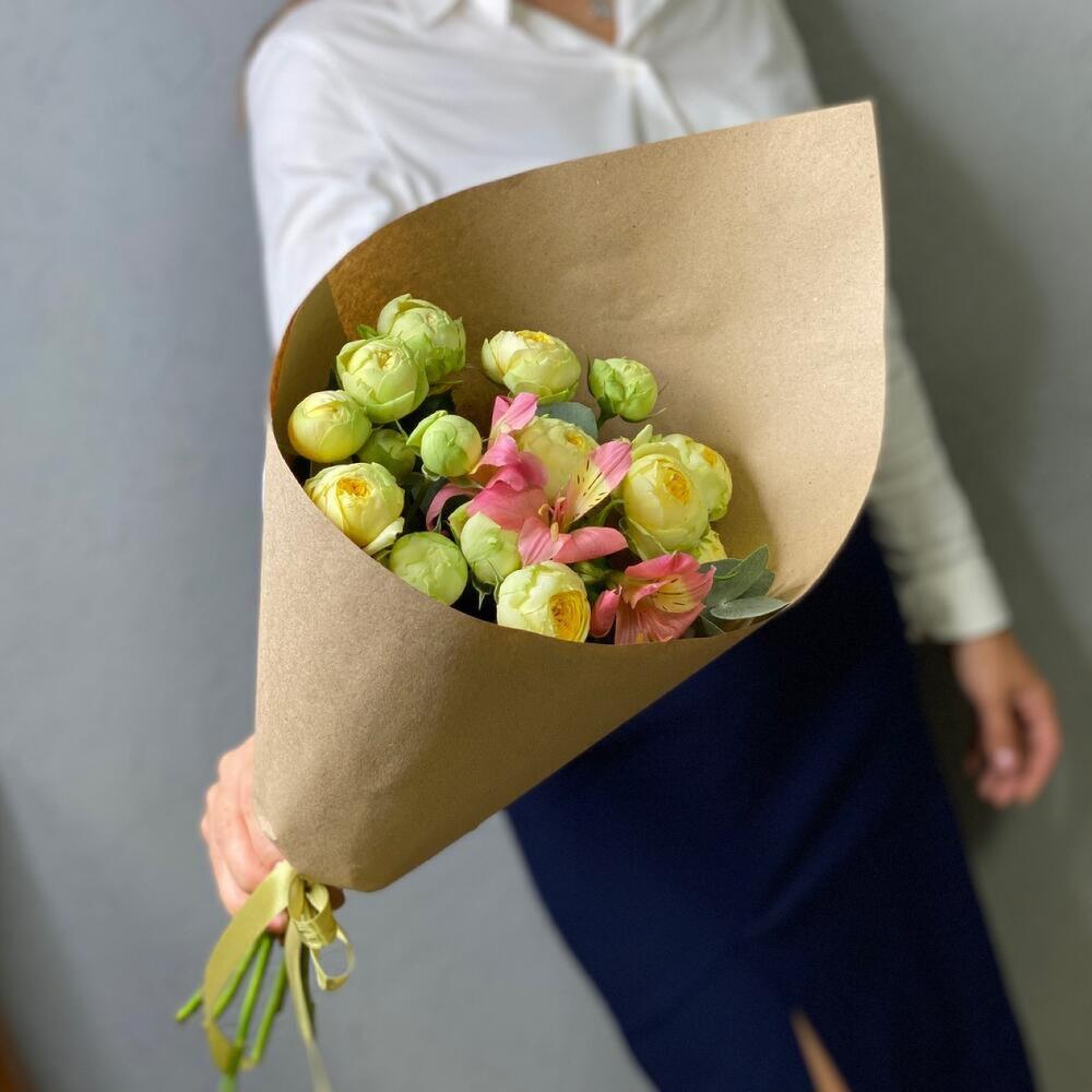 Роза пионовидная желтая – 5 шт. Альстромерия – 1 шт. Крафт – 1 шт. Открыточка с вашими пожеланиями – 1 шт. доставка – 1 шт.