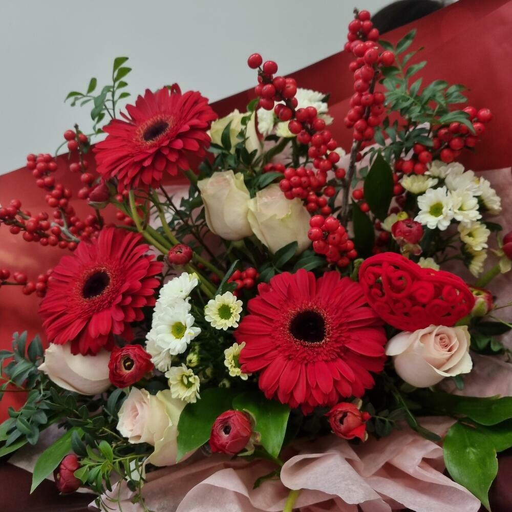Илекс красный – 2 шт.Гербера – 3 шт.Роза Эквадор – 6 шт.Сантини – 3 шт.Ранункулюс – 8 шт.Зелень – 5 шт.Упаковка дизайнерская – 2 шт.