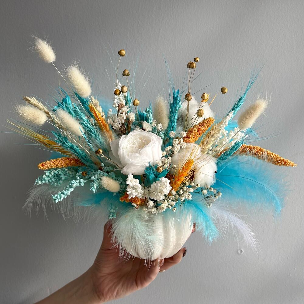 Гипсофила – 1 шт.Статица белая – 1 шт.Нигелла – 1 шт.Лен – 3 шт.Кашпо керамическое – 1 шт.Оазис флористический – 1 шт.Хлопок натуральный – 2 шт.Лагурус (сухоцвет) – 7 шт.Пшеница (сухоцвет) – 13 шт.роза пионовидная стабилизированная – 1 шт.перья декоративные – 23 шт.сетария сухоцвет – 3 шт.сорго стабилизированный – 8 шт.