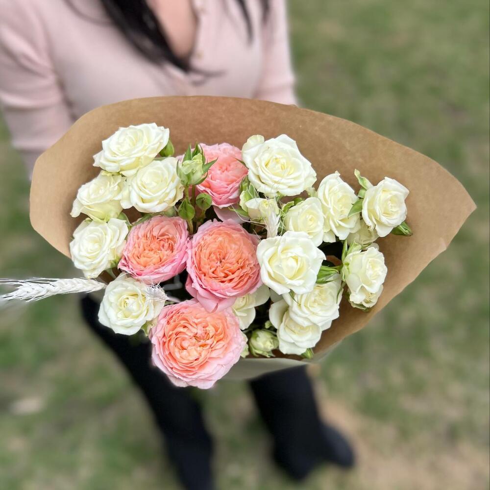 Роза кустовая пионовидная джульетта – 1 шт.роза кустовая сноулейк – 3 шт.Колосья пшеницы – 1 шт.