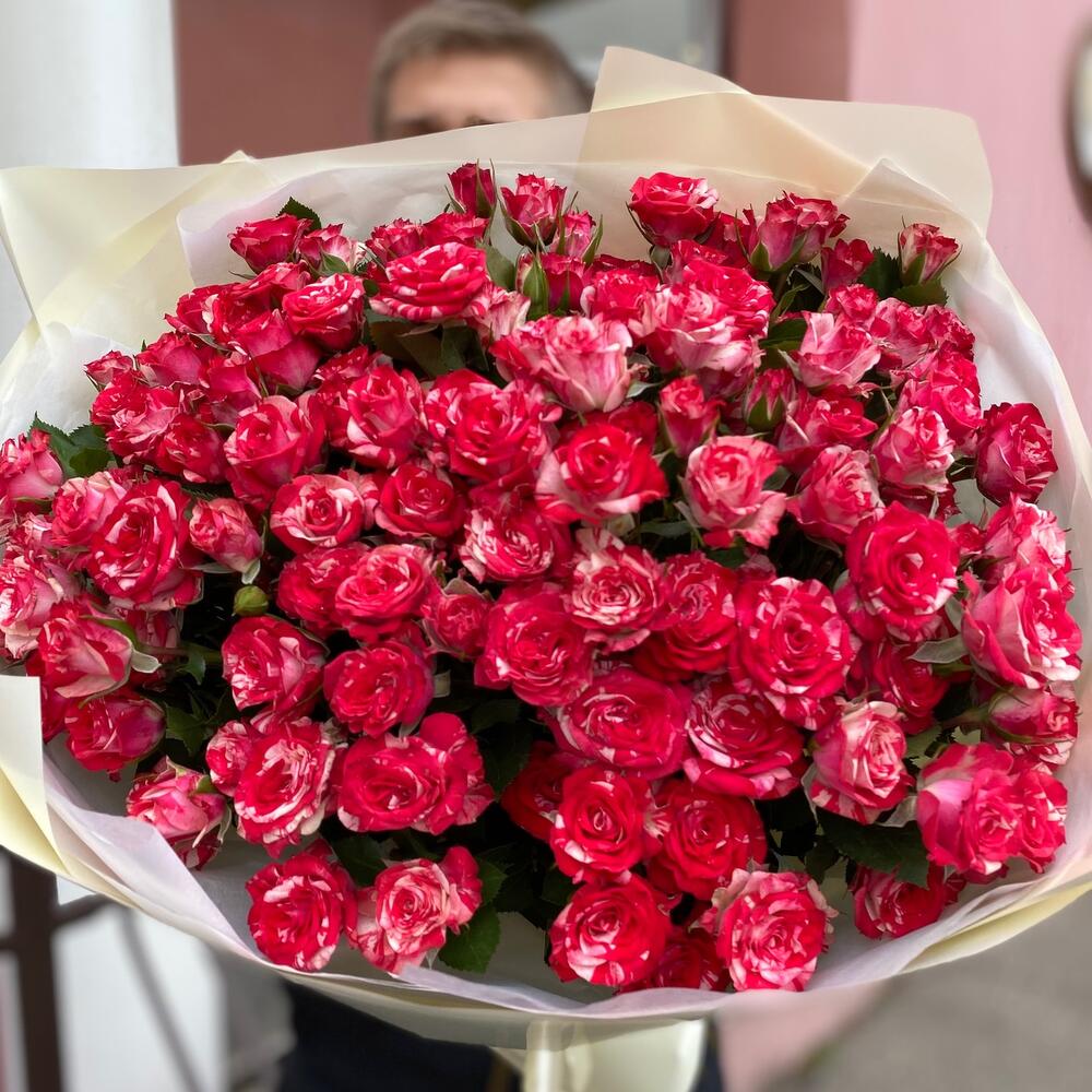 Букет из 19 веток кустовых роз сорта фаер воркса. Количество роз (бутонов) может достигать 131 штуки.