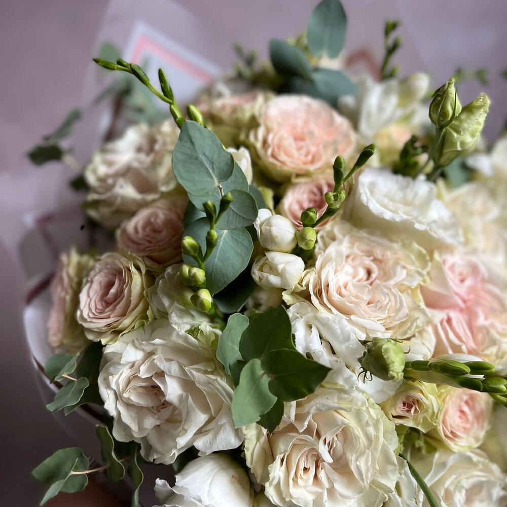 Пионовидная роза – 11 шт.Фрезия – 13 шт.Кустовая роза – 7 шт.Эвкалипт – 3 шт.декоративная упаковка – 1 шт.Атласная лента – 1 шт.