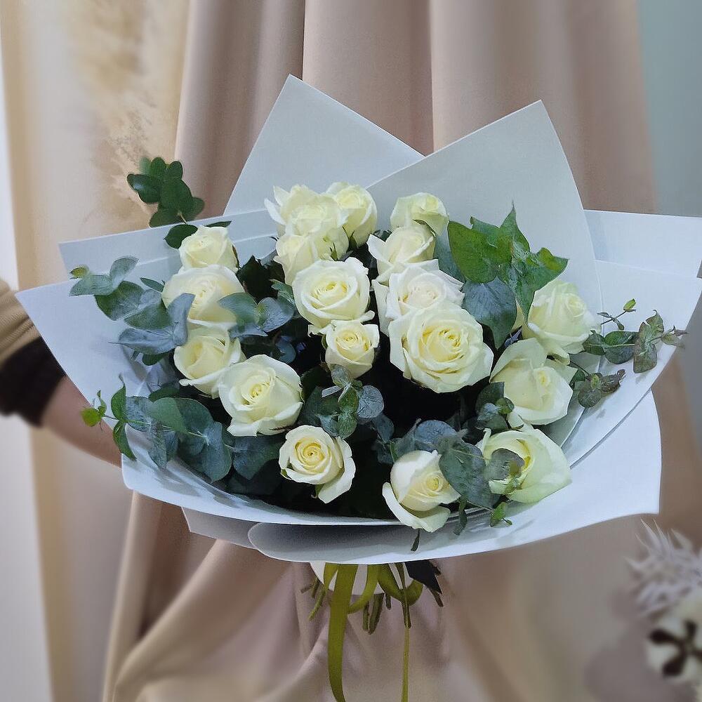 Роза – 21 шт.Эвкалипт – 6 шт.Дизайнерская упаковка – 1 шт.Лента атласная – 1 шт.подкормка для срезанных цветов – 1 шт.