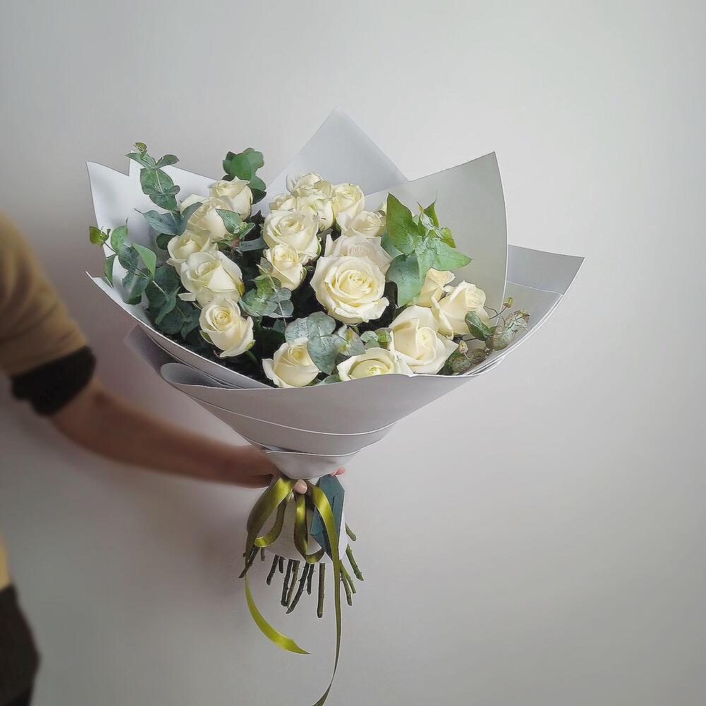 Букет из белых роз и эвкалипта