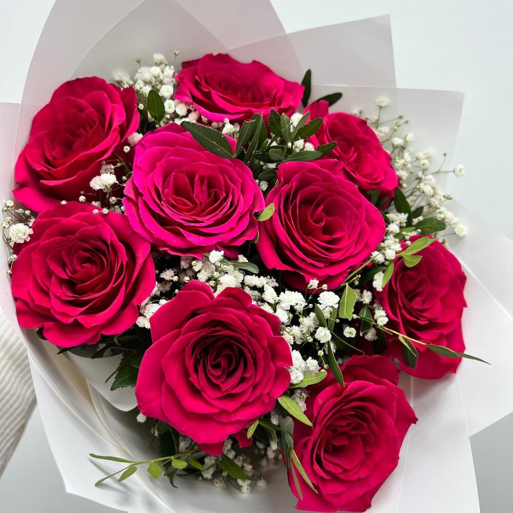 Гипсофила – 2 шт.Роза – 9 шт.Упаковка дизайнерская – 1 шт.