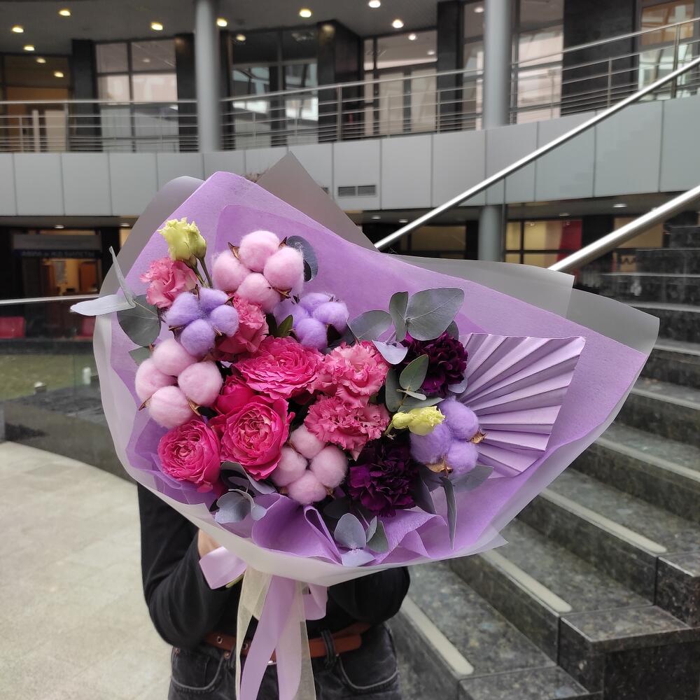 Роза кустовая пионовидная – 1 шт.Лизиантус – 1 шт.Диантус – 2 шт.Хлопок – 6 шт.Пальма – 1 шт.Эвкалипт – 1 шт.Лента – 2 шт.Упаковка дизайнерская – 2 шт.
