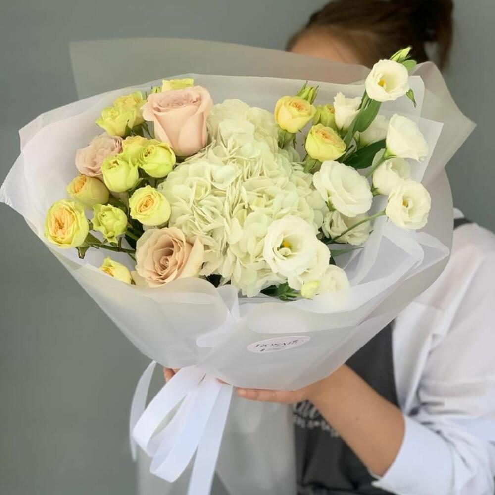 Альстромерии, Гвоздики, Кустовые розы, Лизиантусы, Розы, Хризантемы