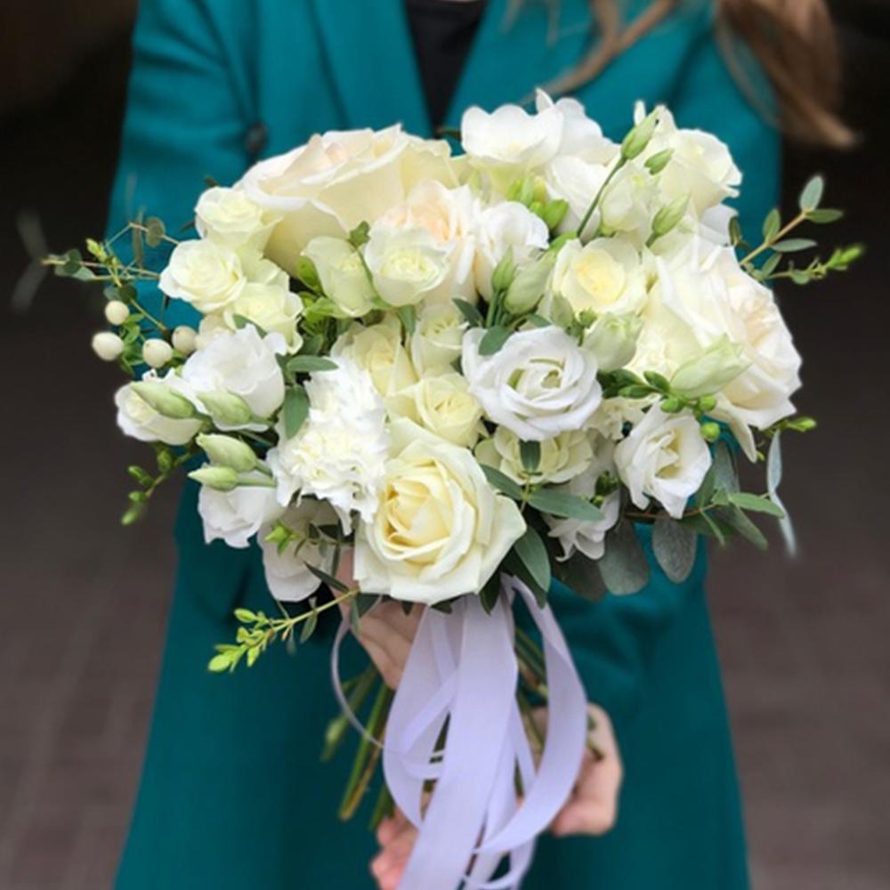 Роза кустовая – 5 шт.Лизиантус – 7 шт.Роза одноголовая – 5 шт.Фрезия – 9 шт.Эвкалипт – 1 шт.Гиперикум – 1 шт.Лента атласная – 2 шт.