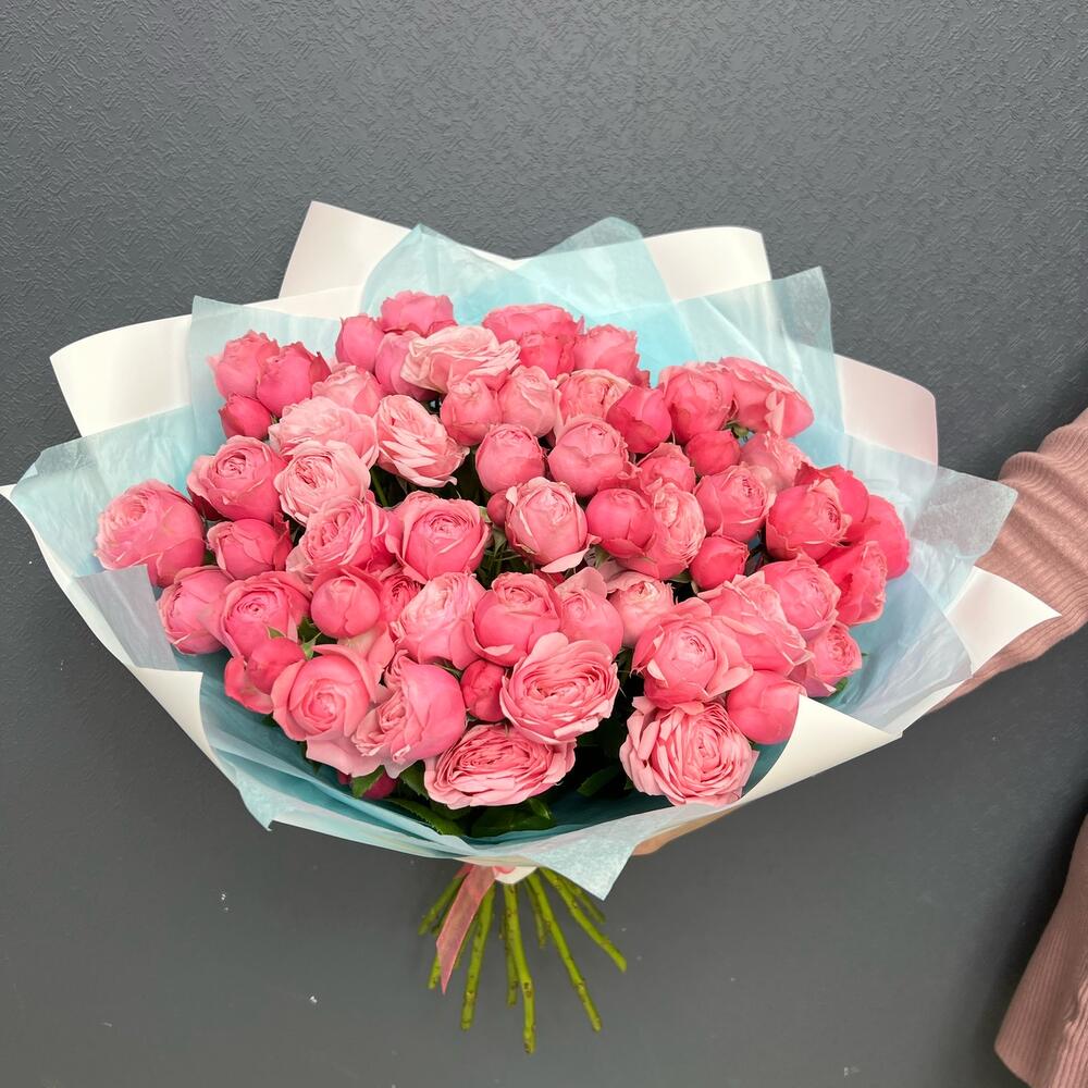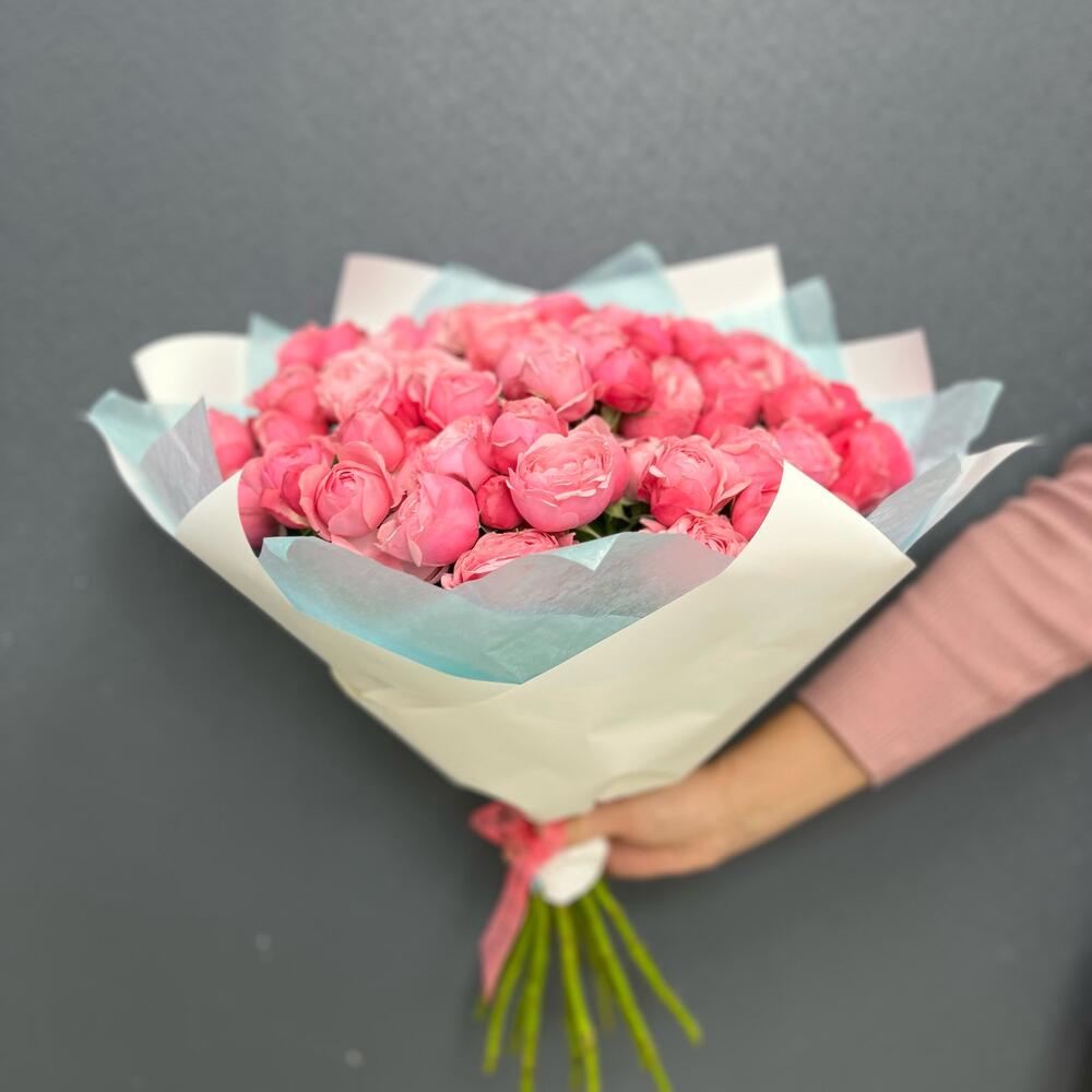 Лента – 2 шт.Тишью – 2 шт.Пленка матовая – 2 шт.роза сильва пинк пионовидная – 15 шт.
