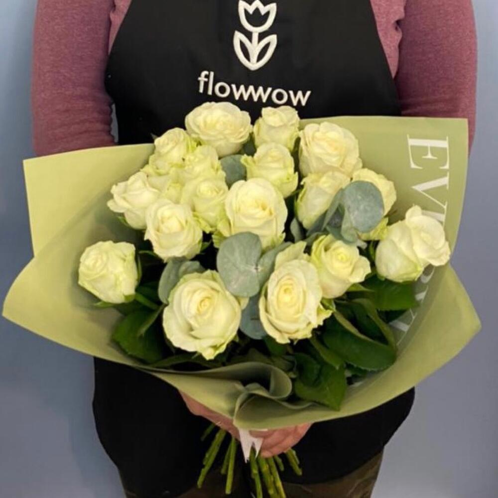 Роза белая – 17 шт.Эвкалипт – 3 шт.Упаковка – 1 шт.Лента атласная – 1 шт.