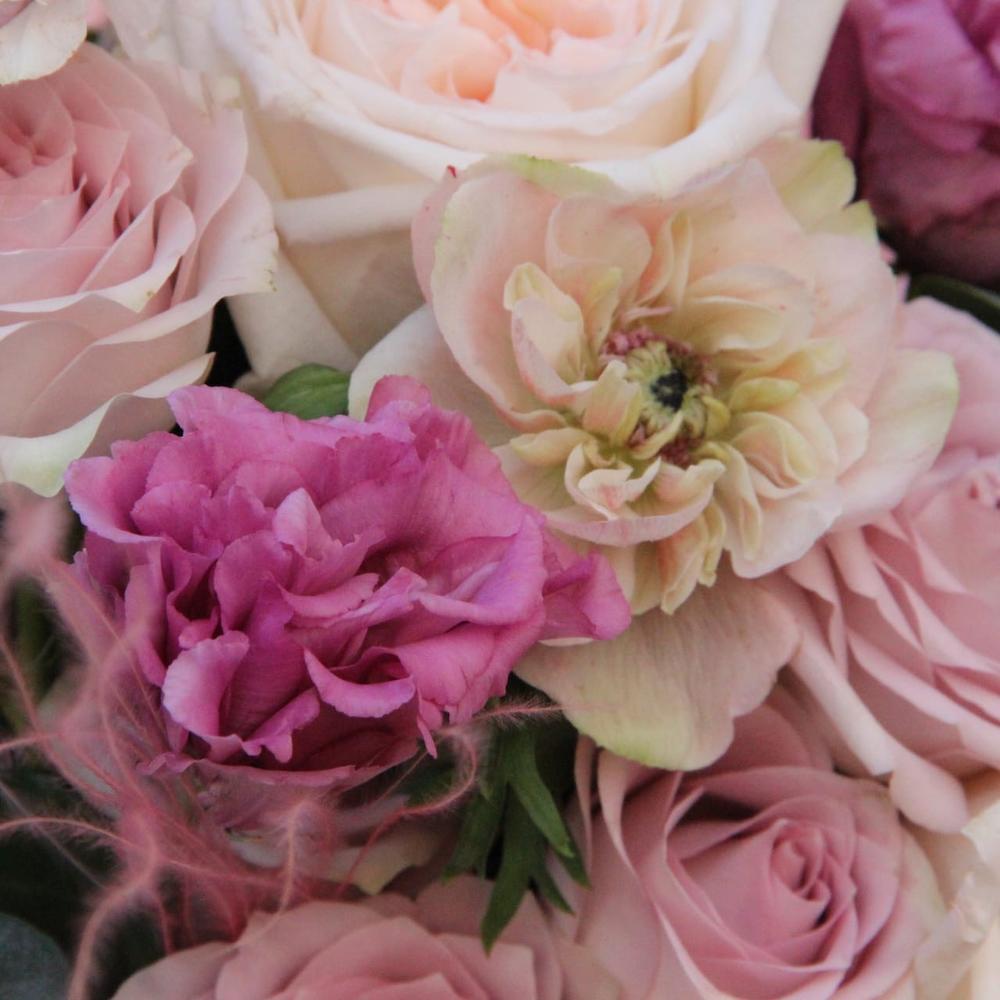 Анемон – 3 шт.Роза пионовидная – 5 шт.Роза – 7 шт.Лизиантус – 3 шт.Ковыль – 2 шт.Фисташка – 3 шт.Эвкалипт – 7 шт.Упаковка – 2 шт.Лента атласная – 2 шт.