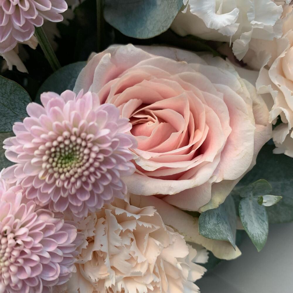 Роза одноголовая – 2 шт.Диантус – 3 шт.Сантиния – 1 шт.Маттиола – 1 шт.папоротник ветка – 1 шт.Эустома – 1 шт.