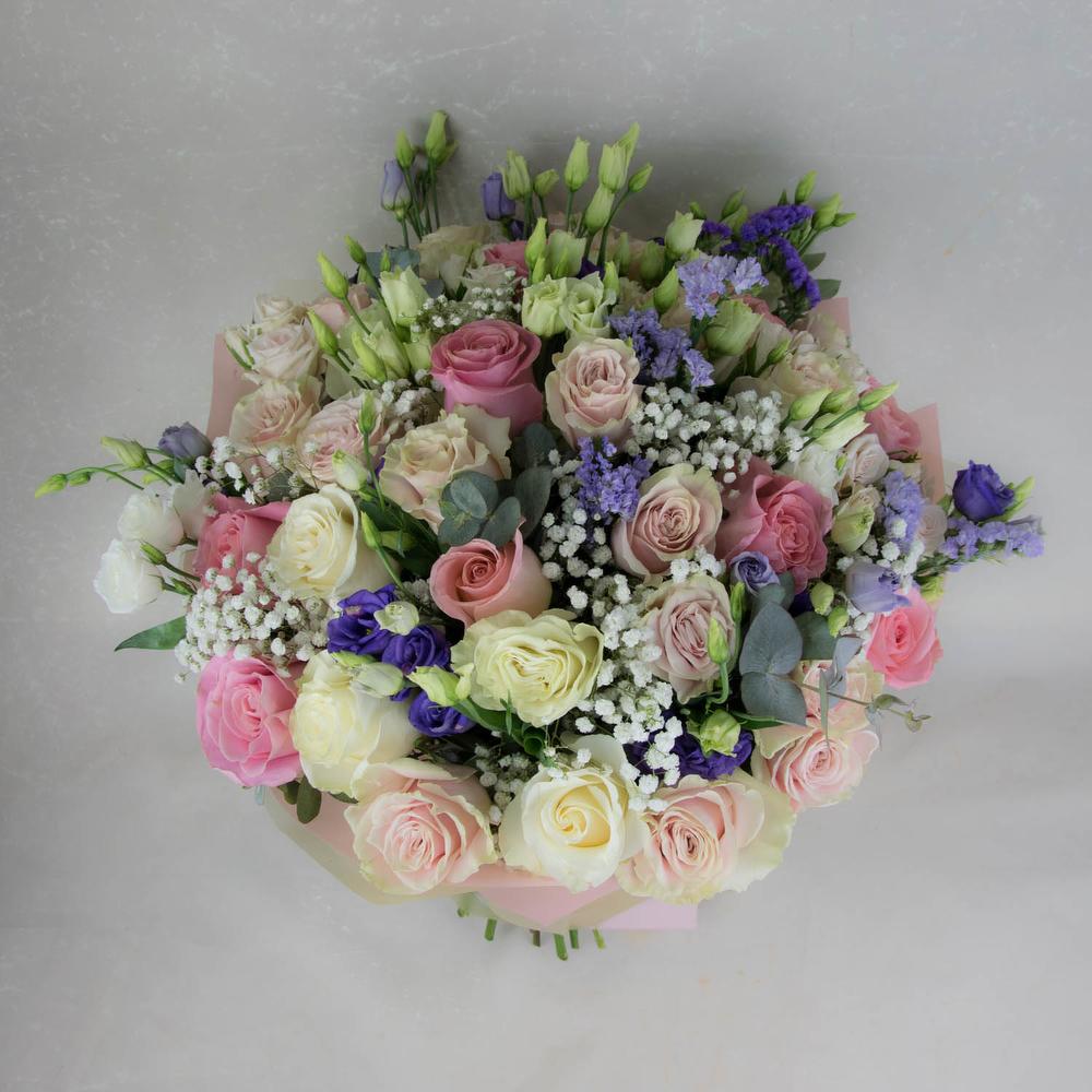 Роза – 35 шт. Эустома – 8 шт. Гипсофила – 5 шт. Упаковка – 1 шт.