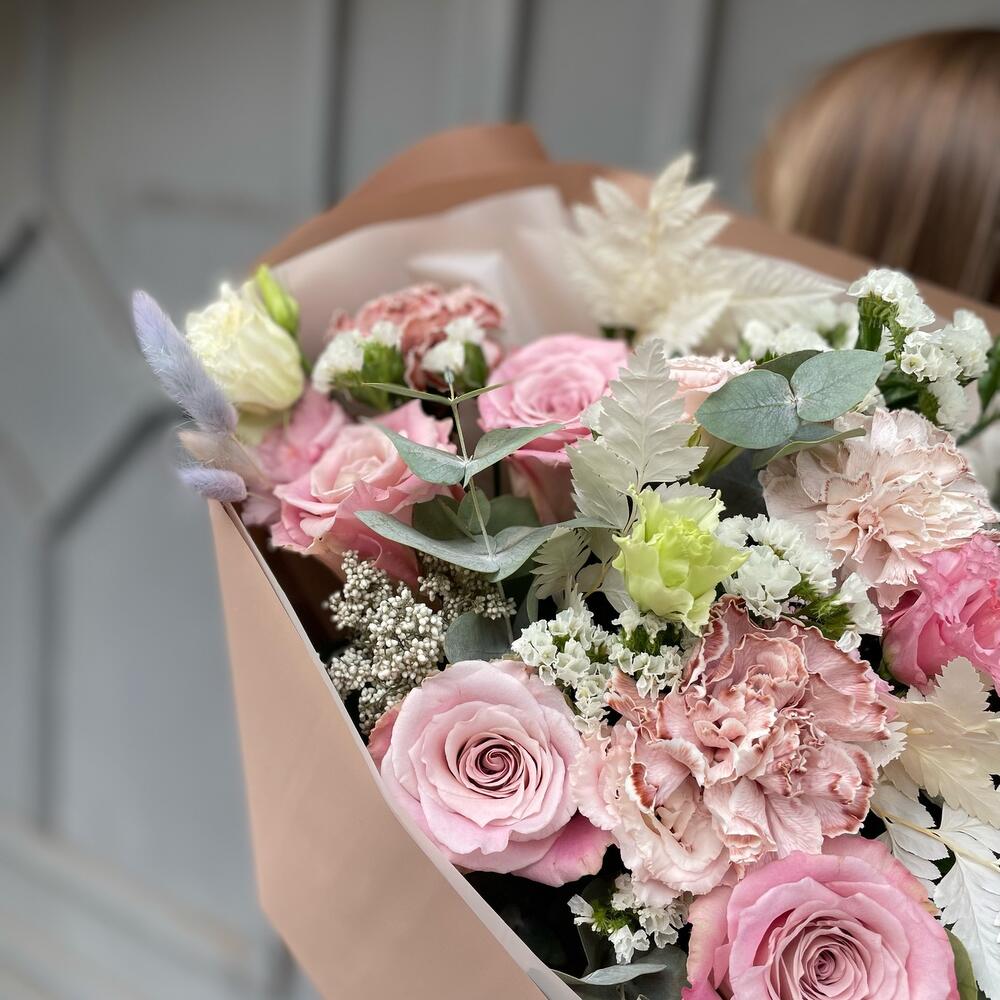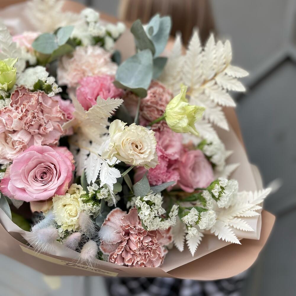 роза faith премиум – 5 шт.Статица – 3 шт.Диантус – 5 шт.Лизиантус алиса пинк – 4 шт.Озотамнус – 1 шт.Лагурус – 9 шт.Листья папоротника – 2 шт.Эвкалипт – 1 шт.