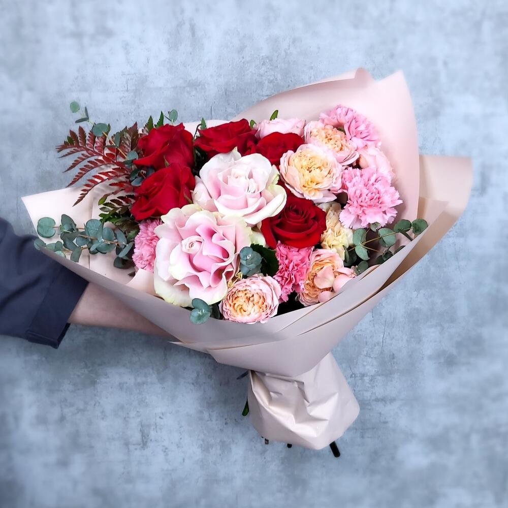 Гвоздики, Лизиантусы, Розы, Тюльпаны