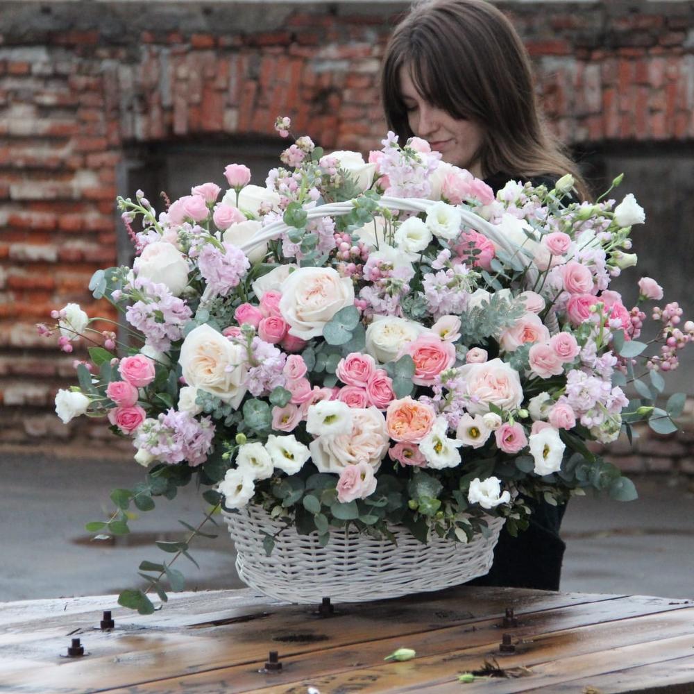 Роскошная корзина, с пионовидными розами, ароматными маттиолами, лизиантусом, кустовыми розами, эвкалиптом и снежноягодником.Стильное цветочное решение длялюбого случая.