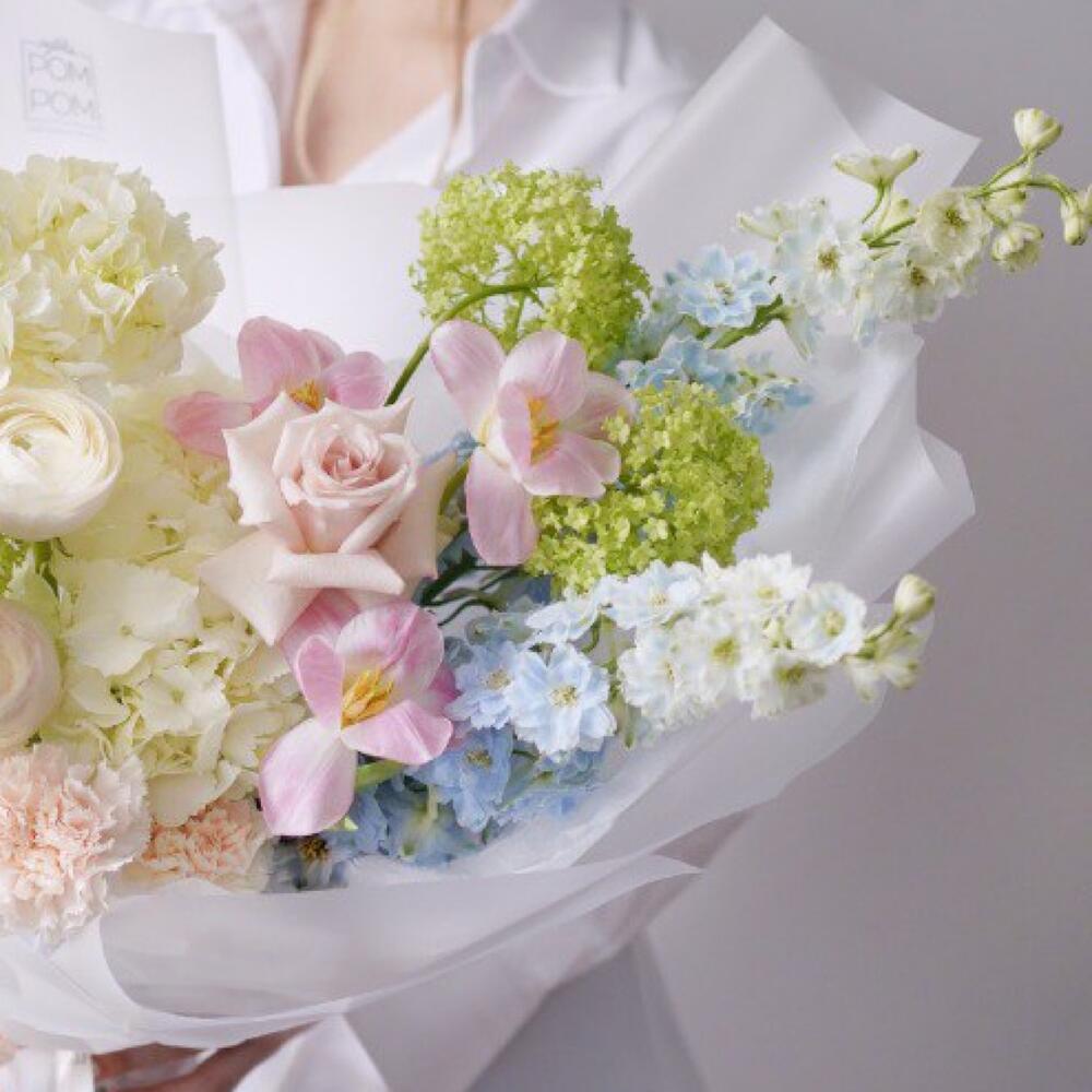 Гортензия – 2 шт.Роза – 3 шт.Дельфиниум – 2 шт.Ранункулюс – 2 шт.Тюльпан – 3 шт.Диантус – 2 шт.Вибурнум – 2 шт.Упаковка дизайнерская – 1 шт.