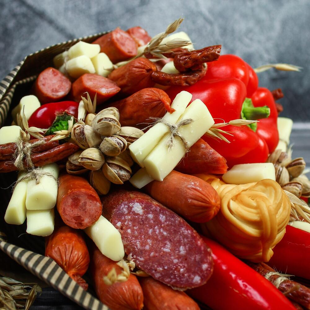 охотские колбаски уп. – 1 шт.сыр палочками пачка – 1 шт.сырокопченые колбаски уп – 1 шт.Сыр косичка – 1 шт.болгарский перец – 1 шт.Перец чили – 3 шт.Сырокопченая колбаса – 1 шт.Фисташка пучок – 3 шт.Сухоцветы – 5 шт.