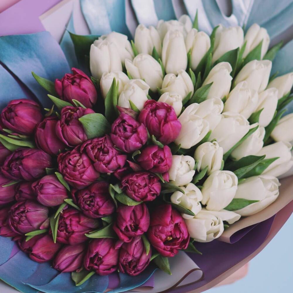 Тюльпан пионовидный – 51 шт.Монстера – 2 шт.Упаковка дизайнерская – 1 шт.